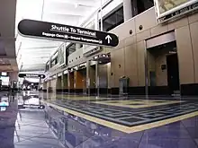 Tampa International Airport's Landside/Airside terminal was the first of its type in the world.[26] There is a central Landside Terminal where baggage and ticketing functions take place. The Landside Terminal is surrounded by four Airside satellites where airliner embarkment and disembarkment occur. Each Airside is connected to the Landside Terminal via an elevated automated people mover (APM) system which employs 16 Bombardier Innovia APM 100 Shuttle Cars. TPA was the first airport in the world to deploy a fully automated, driver-free people mover system and is host to Bombardier Transportation's longest-running APM system. There are four active airsides (A, C, E, and F) with 59 gates.[27] All were constructed after 1985 and all airsides include a food court and gift shop, as well as outdoor smoking patios. Airsides E and F contain duty-free shops in addition to the regular gift shops to serve passengers arriving or departing on international flights.[28][29]