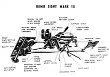 Where it differed was in the addition of the "drift bar" setting at the extreme rear of the sighting system. The drift bar was a metal rod that extended rearward from the sight and was pivoted so it could rotated outward, away from the aircraft fuselage. Prior to the bomb run, the pilot or bomb aimer would dial in an estimated wind speed, which rotated the bar outward with increasing values. They would then look past the bar to any convenient objects on the ground, comparing its direction of motion to the line of the bar. Fine adjustments to the wind speed were made until the observed drift was directly along the line of the bar.