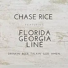 "Drinkin' Beer. Talkin' God. Amen." is a song recorded by American country music singer Chase Rice featuring American country music duo Florida Georgia Line. It was released on November 30, 2020 as the second single from his album The Album. Rice wrote the song with Cale Dodds, Corey Crowder and Hunter Phelps, and produced with Crowder and Florida Georgia Line.[1]