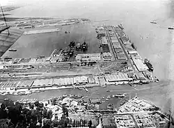 Besides shipbuilding and ship repair the company also got involved in the sugar industry in Java during the interwar period. It started to provide repairs for kettles that were used to produce sugar and used its foundry to build work items that were used by the factories.[14] Shipbuilding and ship repair also continued in this period with 1928 being an especially great year for the company with DMS getting many new orders to build ships.[15] To fulfill this increase in demand, the shipbuilding of wooden and steel ships was modernized.[16] DMS also expanded the infrastructure of the shipyard during this period by gaining a third drydock that could handle ships up to 1400 tons and building a second large building on its terrain.[2] The only downside was that the prices for new ships and ship repair continued to be low.[15] While the company was doing well in the 1920s this started to change at the beginning of the 1930s. At the time only the 14,000 tons dock was frequently used and the other two docks were in comparison mostly empty.[17] This led to DMS firing a total of 300 workers in 1930.[18] After receiving support from the Government DMS was performing better and as a result the shipyard had a busy schedule in 1932.[19] The 1930s also saw DMS having some large and unusual orders. For example, between 1933 and 1934 DMS inserted a new mid ship hull section in the middle of the tanker Hermes as the old hull had suffered from wear and tear.[20] This was a rather unique operation at the time as this had only been done so far to 3 ships in the world.[20] In 1937 the DMS signed up for the construction of a new large tin dredger that would replace the Kantoeng.[21] The pontoon of the dredger would be built at DMS in the Dutch East Indies while the superstructure would be built in the Netherlands.[22] Eventually DMS managed to reach an agreement with the shipyard Gusto to build the tin dredger together.[21] Gusto would build the superstructure in the Netherlands and, after disassembling, ship it to the Dutch East Indies where everything would be put together and completed at DMS.[23] On 20 and 21 August 1938 the dredger, in the meanwhile named Soengei Liat, successfully passed trials in the harbor of Soerabaja.[24] The decade ended with DMS being in a good financial position and having favorable prospects regarding work and orders.[25] Besides the three dry docks it also owned a total of five slipways around this time.[25]