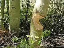 The collection of virilis group flies, including D. montana, is significantly more successful when close to known beaver residences. Beavers preferentially reside in bodies of water close to specific tree species including birch and alder, which they feed on in the winter. The beavers' feeding activity produce fallen trees and stripped bark that supply D. montana, as well as other members of the virilis group, with their preferred sites of oviposition. Alder trees are specifically cited as a favored site of D. montana oviposition. These shared resources support commensalism between the two species. For D. montana, this relationship is typically observed in North America, specifically with the beaver species Castor canadensis.[16]