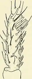 The upper reclinate fronto-orbital bristles are long, the middle reclinate bristles are short, and the lower proclinate bristles are medium in length. Proportionally, the listed bristles lengths can be characterized in a 4:2:3 fashion. The ocellar, post-vertical, and inner and outer vertical bristles are all about the same length as the upper reclinate fronto-orbital bristles. The bristle behind the vibrissa is less than half the length of the upper reclinate fronto-orbital bristles. The species also has two pairs of dorso-central bristles, which contain 8-10 rows of acrostichal hairs. No acrostichal bristles are seen to have developed in the species. The anterior scutella bristles are parallel to each other. The anterior sternopleural bristles are shorter than the posterior ones. The wings have costal bristles. The pre-apical tibial and apical tibial bristles of the legs are not exceptionally long.[1]