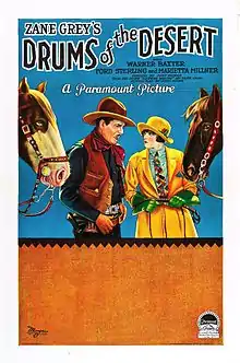 Drums of the Desert is a 1927 American silent Western film directed by John Waters and written by Zane Grey and John Stone. The film stars Warner Baxter, Marietta Millner, Ford Sterling, Wallace MacDonald, Heinie Conklin, George Irving, and Bernard Siegel. The film was released on June 4, 1927, by Paramount Pictures.[1][2]