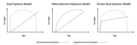 Recently, another variation of the dual systems model was proposed called the "driven dual systems model".[5] This model proposes an inverted-U shaped trajectory of socioemotional system responsivity, similar to the dual systems model, but hypothesizes a cognitive control trajectory that plateaus in mid-adolescence. This cognitive control trajectory differs from that proposed by the dual systems model and maturational imbalance model which continues to increase into the early 20s. Similar to the driven dual systems model, a model has been proposed including a hyperactive socioemotional system that undermines the regulatory ability of the cognitive control system.[11] These later models hypothesize that cognitive control development is completed by mid-adolescence and attribute increased risk-taking during adolescence to the hyperarousal of the socioemotional system. The dual systems model and maturational imbalance model propose that cognitive control development continues into early adulthood and that increased risk-taking in adolescence is attributable to a developmental imbalance where the socioemotional system is at its peak of development but the cognitive control system developmental trajectory lags behind.[12]