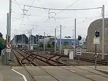 In other aspects, the two lines are identical except that the inter-axis width between the tracks on the Green Line is slightly wider than on the Red Line. The construction planning for the Green Line ensures a distance of track centres at 3,400 millimetres (11 ft 1+78 in) including a 400 millimetres (15+34 in) extra for the kinematic envelope of metro trains.[39] This does not relate to the track gauge of 1,435 mm (4 ft 8+12 in), which is identical on both lines. This will allow wider metro trains be run on the same tracks if a proposed upgrade to full metro service is implemented.[40] This is possible because the route uses an old railway line and as such has few interactions with vehicular or pedestrian traffic. The Railway Procurement Agency has stated (November 2006) that "We still envisage conversion of almost all Luas lines to light metro standard in the long-term.".[12] Platform length also varies between lines, with the original 40-metre (131 ft 3 in) platforms lengthened to 55 metres (180 ft 5 in) on the Green Line [41]