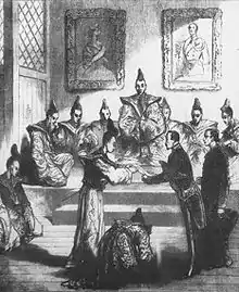 The following year, he went again to Japan, arriving on 6 September 1859,[3] and became the first French representative in the country,[4] with the title of "Premier ministre plénipotentiaire de France au Japon". He was assisted by the translator Father Girard. Duchesne de Bellecourt played an important political role in Japan in the late 1850s and 1860s, alongside fellow Western diplomats Dirk de Graeff van Polsbroek, Townsend Harris, Rutherford Alcock and Max von Brandt. Although these men were bound by personal friendship, national rivalries and differences in dealing with the Japanese led to conflict and antagonism. However, the chaotic and ungovernable circumstances of the first few years forced them to cooperate.[5]