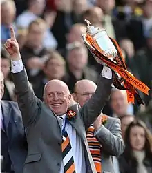 Following a number of board changes, the club was purchased from McLean in 2002 by former Morning Noon and Night co-founder and chief executive Eddie Thompson.[15] A lifelong United fan, Thompson invested heavily in the team in a bid to compete with significant spending which had developed following the formation of the Scottish Premier League, however little progress was made until Craig Levein became manager in 2006. Levein established United as a top six club, regularly achieving European qualification before he left the club to take the post as Scotland men's national team manager in 2009.[16]