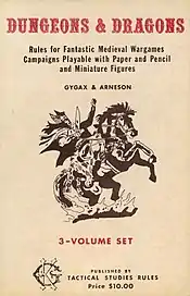 The original Dungeons & Dragons set, subtitled Rules for Fantastic Medieval Wargames Campaigns Playable with Paper and Pencil and Miniature Figures, was written by Gary Gygax and Dave Arneson, and was published by TSR in 1974 as a digest-sized boxed set in a brown wood-grain box.[1] The set included three digest-sized books: the 36-page "Volume 1: Men & Magic", the 40-page "Volume 2: Monsters & Treasure", and the 36-page "Volume 3: The Underworld & Wilderness Adventures".[2] The set also included six reference sheets of tables and charts.[1] Advertisements for the game first started appearing in Spring 1974.[3]