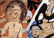 The caves are commonly referred to in Chinese as the Caves of the Thousand Buddhas (Chinese: 千佛洞; pinyin: qiānfó dòng), a name that some scholars have speculated to have come from the legend of its founding, when a monk Yuezun had a vision of a thousand Buddhas at the site. This name, however, may have come from the large number of Buddha figures at the site, or the miniatures figures painted on the walls of these caves as these figures are called "thousand Buddhas" colloquially.[5] The name Mogao Caves (Chinese: 莫高窟; pinyin: Mògāo kū) was used in the Tang dynasty, where 'Mogao' refers to an administrative district at the site during the Tang dynasty.[6] Mogao may mean "peerless" (literally "none higher", where "mo" means "none", and "gao" means "high");[7][8] an alternative reading may be "high in the desert" if "mo" is read as a variant of the Chinese term for "desert".[9] Mogao is also used as the name of a modern town that is administered by Dunhuang city: Mogao Town (莫高镇).[10][11] The Mogao Caves are also often referred to as the Dunhuang Caves after the nearest city Dunhuang, which means "blazing beacon" as beacons were used at the frontier outpost to warn of attacks by nomadic tribes.[12] The term Dunhuang Caves however is also used in a broader sense as a collective term for all the caves found in or around the Dunhuang area.[13]