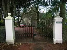 The Dunlop Golf Course had nine holes and was at first located at Hapland in 1908 but moved to Templehouse in 1909 where it remained until closure in 1922. The ground was reported to be "of a sporting character, being varied and undulating. It is about a twelve-minute walk from the station, and about two miles [three kilometres] from Stewarton. The membership fee of 10 shillings for gentlemen and 5s for ladies is very moderate. In 1914 the secretary was J H Marr, 2 Mansfield Terrace. A 9 hole course situated on Templehouse Grounds with a membership of 150. There was no entry fee. Subs were 12/6d. Visitors’ fees were 1/- a day and 2/6d a week. Sunday play was not allowed." The only remains are that of a bunker that overlooks the ruins of Templehouse.[45] It operated from 1911 through to 1915 and at the AGM the freedom of the course was granted to all military personnel, nurses and staff stationed at the Dunlop House Military Hospital; in addition they decided to retain the membership of those members serving in the Forces.[46]