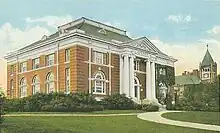 Benjamin Thompson, a descendant of an early settler, bequeathed his assets and family estate, Warner Farm, to the state for the establishment of an agricultural college.[20][21] Founded in 1866 in Hanover, the New Hampshire College of Agriculture and the Mechanic Arts moved to Durham in 1893 and became the University of New Hampshire in 1923. Thompson Hall, built in 1892 with an iconic clock tower, is named in his honor. Designed in the Romanesque Revival style by the Concord architectural firm of Dow & Randlett, it was listed on the National Register of Historic Places in 1996.[22]