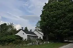 The Durham House is located south of the village center of Goshen, at the northwest corner of Ball Park Road and New Hampshire Route 31. Its main block is a 1+1⁄2-story Cape style wooden structure, with a gabled roof and two chimneys, measuring about 32 by 24 feet (9.8 m × 7.3 m). Its walls are formed out of 3-inch wooden planks placed vertically, with lateral stability provided by wooden dowels. The exterior is finished in clapboard siding. The main facade is five bays wide, with sash windows flanking a center entrance. The entry has a six-panel door and full-length sidelight windows, and is sheltered by a gabled portico. Shed dormers adorn the front and rear roofs, and there is a garage extending to the left and a single-story enclosed porch to the rear.[2][3]