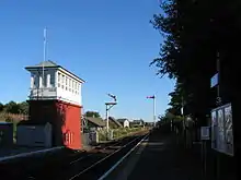 Dyce signal box, which opened in 1880, was a tall structure located at the south (Aberdeen) end of the station, on the east side of the railway. In 1928, the box was provided with a new frame of 46 levers, subsequently reduced in size to 26 levers.