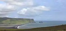 The view from Dyrhólaey is broad: To the north is to be seen the big glacier Mýrdalsjökull. To the east, the black lava columns of the Reynisdrangar come out of the sea, and to the west the whole coastline in the direction of Selfoss is visible – depending on weather conditions. In front of the peninsula, there is a gigantic black arch of lava standing in the sea, which gave the peninsula its name (meaning: door hill island).[6]