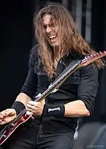 Additionally, several hardships struck the band in 2014. In May, bassist David Ellefson lost his brother Eliot to cancer, after which the band cancelled a number of scheduled shows.[12] On October 4, Mustaine's Alzheimer's-afflicted mother-in-law went missing from a campground. Her remains were discovered on November 26.[13] Furthermore, drummer Shawn Drover and guitarist Chris Broderick announced their resignations from the band that November.[14] The pair would later emerge in a new band, Act of Defiance.[15]