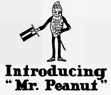 The first commercial version of Mr. Peanut created by E. C. Stoner from the competition entry of 14-year-old Antonio Gentile in 1916.