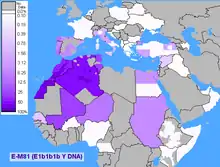 The E-M183 sub haplogroup reaches a mean frequency of 42% in North Africa. It decreases in frequency from 100% in some populations to approximately 28.6% to the east of this range in Egypt.[3][20][21] The E-M81 subclade is predominant among North African Berber-speaking populations. In Tunisia, it reached 100% frequency among a sample of Arabs from Zriba,[22] 89.5% in Andalusians (Qalaat-al-Andalous), and 100% in Berbers from Chenini-Douiret, Jradou and Takrouna.[22] It is generally found at frequencies around 45% in coastal cities of the Maghreb (Oran, Tunis, Algiers).[3][23]