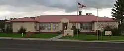 The building sits at the southeast corner of Main and Second Streets.[3]: 15 Originally, the building included 6 classrooms, 4 offices (principal's, secretary's, attendance, and main), and 2 restrooms.[3]: 16 The central façade is flanked by two small wings, which protrude slightly towards Main Street, forming a small "C" shape. The foundation and walls are brick, which has since been stuccoed over. The windows were double-hung, three-over-three wood construction, in vertical proportion in groups of two to four with common sills. These have been replaced by aluminum windows, one-over-one single hung inserted into the original sash frames. Doors were originally "wooden, single- light doors with multi-light transoms overhead", with most now replaced by modern units. Broad stairs led to the main entries in the front, back, and both sides, although the stairs on the south side were destroyed with the construction of the cafeteria addition. There are also several smaller sets of steps leading to the outside from minor entrances. The entrances are framed by pedimented parapets, which sit on pilasters. The roof has a low pitch with wide overhangs, and is covered with asbestos tiles in a diamond pattern.[3]: 5–6