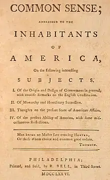 In the years prior to the Revolutionary War, Massachusetts played an influential role in supporting the Revolution. Boston was considered by royal authorities as a "hotbed of sedition".[156] During this time printers and publishers played a fundamental role in promoting the call for independence in the and uniting the American colonies in that end. Thomas Paine's 1776 work, Common Sense, outlined moral and political arguments and is considered "the most incendiary and popular pamphlet of the entire revolutionary era", and was printed by Robert Bell.[157] In response to Paine's work, James Chalmers, under the assumed name of Candidus[lower-alpha 15] countered it with a pamphlet entitled The Plain Truth, also printed by Robert Bell, which was not received well by a patriotic populace who drove Chalmers into exile.[158]