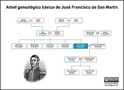His father was Juan de San Martín, native of Cervatos de la Cueza (province of Palencia), born on February 3, 1728. He was in the military, but couldn't get promoted beyond captain because of not being noble. He arrived to South America in 1765. His mother was Gregoria Matorras del Ser, native of Paredes de Nava (province of Palencia), born on March 12, 1738. They got married on 1 October 1770, settling in the Banda Oriental (Viceroyalty of the Río de la Plata). They had three children there: María Helena, Manuel Tadeo and Juan Fermín. Juan was designated governor of Yapeyu in 1774, they had their fourth son, Justo Rufino, and finally José Francisco de San Martín.[4]
