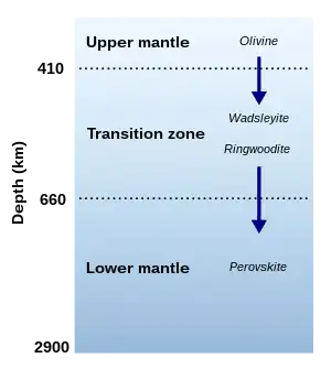 - the transition zone (approximately 410–660 km [250–410 mi]), in which wadsleyite (≈ 410–520 km [250–320 mi]) and ringwoodite (≈ 525–660 km [326–410 mi]) are stable