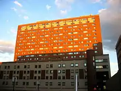 East Campus was originally clad in red and white tiles, a surfacing architectural critics praised as innovative. The American Institute of Architects Guide to New York City called it "elegant and handsome".[7] Reception to the building was mixed overall. Architecture critic Ada Louise Huxtable wrote of East Campus:
