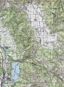 Coyote Valley is flanked by rolling hills that rise 400 ft (120 m) about the valley floor to the west of Lake Mendocino and steeper Franciscan bedrock hills to the east.[8] Elevations above mean sea level in the surrounding region range from about 600 ft (180 m) in the valleys near Ukiah to about 3,975 ft (1,212 m) on top of Cow Mountain to the east.[8] The hills to the east of Lake Mendocino are very rugged and continue for many miles. To the west and northwest, the hills are more rounded with benches that were once planted with vineyards.[9]
