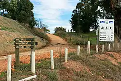 The track leaves Nowa Nowa after crossing the bridge over Boggy Creek and soon rejoins the railway line formation. The former Nowa Nowa railway station is just north of the realigned rail trail, with the station site itself now used as an emergency helicopter landing place.[5] Not far from town the track descends to a creek level crossing over Ironstone Creek, bypassing the first and smallest of three wooden trestle bridges in this section.[7] Following this the track steadily climbs over several kilometres on a rough loose gravel surface through a gradually drier environment largely composed of banksia and eucalypt vegetation, and areas of open farmland, then descends towards Wairewa Road[7] about 9 km from Nowa Nowa.[8] The original rail line crossed this spot on a spectacular curved timber trestle bridge, the largest of the three on this part of the route. While the bridge remains, the trail again bypasses it due to the costs that would be involved in making and keeping the bridge safe, descending down and across Wairewa Road, then climbing back up to the level of the railway.[7]