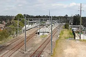A new station was built south-east of the original station as part of the extension opening in August 1987 with the original station closed and demolished.[4] Following the extension, East Hills became the main intermediate terminus and an interchange point between all stops and limited stops trains. In addition to the two through tracks (platforms 2 and 3), a side terminating track (platform 1) was provided. A new centre turnback at Revesby opened in 2009 as part of the Rail Clearways Program, which ended East Hills' role as the primary intermediate terminus.
