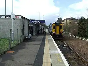 There is a daily half-hourly service (including Sundays) north-west to Glasgow Central with extra journeys during weekday peak periods. The average journey time to Glasgow Central is 30 minutes.[5] The earliest train leaving the station is at 06:18 Monday to Friday, and 08:26 on Sundays. The last train to arrive at the station is at 23:50.[6]