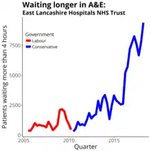 As is common in these situations, the decision was deeply unpopular with the public of the Burnley and Pendle districts, who were most affected by the change.[9] A campaign to save/return the A&E service was a central issue in local politics. Both the district's current MPs were elected in 2010 on a platform of support for the campaign.[10]