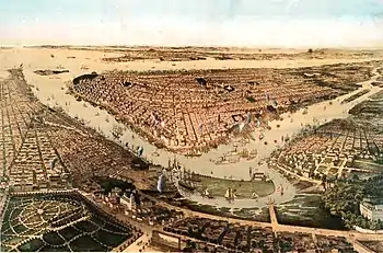 Dutch settlement of what became New Amsterdam began in 1623.[16] Some of the earliest of the small settlements in the area were along the west bank of the East River on sites that had previously been Native American settlements. As with the Native Americans, the river was central to their lives for transportation for trading and for fishing.[17] They gathered marsh grass to feed their cattle, and the East River's tides helped to power mills which ground grain to flour. By 1642 there was a ferry running on the river between Manhattan island and what is now Brooklyn, and the first pier on the river was built in 1647 at Pearl and Broad Streets. After the British took over the colony in 1664, which was renamed "New York", the development of the waterfront continued, and a shipbuilding industry grew up once New York started exporting flour. By the end of the 17th century, the Great Dock, located at Corlear's Hook on the East River, had been built.[16]