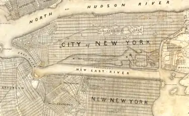 After the war, East River waterfront development continued once more. New York State legislation, which in 1807 had authorized what would become the Commissioners Plan of 1811, authorized the creation of new land out to 400 feet from the low water mark into the river, and with the advent of gridded streets along the new waterline – Joseph Mangin had laid out such a grid in 1803 in his A Plan and Regulation of the City of New York, which was rejected by the city, but established the concept – the coastline become regularized at the same time that the strait became even narrower.[22]