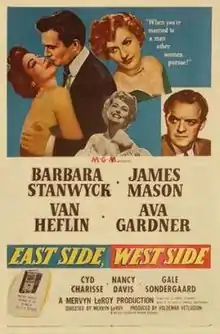 East Side, West Side is a 1949 American melodrama crime film, starring Barbara Stanwyck, James Mason, Van Heflin, and Ava Gardner. Based on the 1947 novel of the same title, written by Marcia Davenport, screenplay by Isobel Lennart, produced by Voldemar Vetluguin, directed by Mervyn LeRoy, and distributed by Metro-Goldwyn-Mayer.