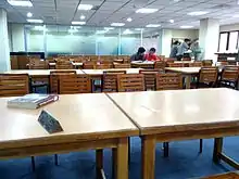 East West University has a library covering about 11000 sq ft. in the new campus with maps and journal area, and has a photocopy corner, database search corner, and newspaper display section. Each day around 2,200 users visit the library. The library contains 22,000 books, a subscription to 135 international and national journals (hardcopy), 3,300 online journals on its database, subscription to 16 national daily newspapers and around 1,500 CD-ROMs and audio cassettes.[6]