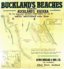Eastern Beach and Bucklands Beach became a popular holiday destination from the 1910s.[22] The Buckland farm was first subdivided in 1916 when Bucklands Beach was established,[23] and the Devonport Steamship Company constructed a second wharf at Bucklands Beach for passenger services.[22] During this time, phoenix palms were planted at Eastern Beach, to give the area a tropical appearance.[24] In 1923, Eastern Beach was subdivided and established as a housing estate,[25] and in 1934 became a regularly used site for the Auckland Caravaning Club.[26]