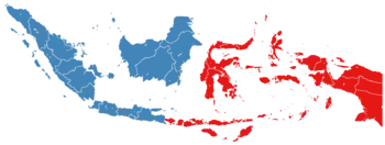During the last stages of the Dutch colonial era, the area east of Java and Kalimantan was known as the Great East and later known as Eastern Indonesia. On 24 December 1946, the State of East Indonesia was formed covering the same area (excluding Western New Guinea). It was a component of the United States of Indonesia, and was dissolved into the unitary Republic of Indonesia in 17 August 1950.[2] Currently, Eastern Indonesia consists of 17 provinces: Bali, East Nusa Tenggara, West Nusa Tenggara, Central Sulawesi, Gorontalo, North Sulawesi, South Sulawesi, Southeast Sulawesi, West Sulawesi, Maluku, North Maluku, Central Papua, Highland Papua, Papua, South Papua, Southwest Papua, and West Papua.[3][4][5] Meanwhile, the region comprising the other 21 provinces in Sumatra, Java, and Kalimantan is known as Western Indonesia.[6]