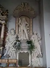 Eberhard Friedrich's grave monument in the Protestant church in Neidenstein, which includes a life-size statue of him, was probably made by Heinrich Charrasky, who also made the statue on the Haus zum Riesen. The monument is flanked by statues of the war god Mars and the hunting goddess Diana, reflecting von Venningen's interests in war and hunting. The dedication gives Venningen's title as:
