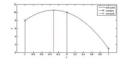 As shown in the right figure, parabolic fit can help find the real peak of the cross correlation function. The equation for parabolic fit in 1D is:[4]