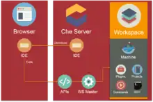 Eclipse Che is an open-source, Java-based developer workspace server and Online IDE (integrated development environment). It includes a multi-user remote development platform. The workspace server comes with a flexible RESTful webservice. It also contains a SDK for creating plug-ins for languages, frameworks or tools.[4] Eclipse Che is an Eclipse Cloud Development (ECD) top-level project, allowing contributions from the user community.[5]