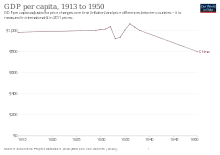 In 1944, the advance of Japan's Ichigo campaign cut the Nationalist-controlled areas of China in half.[9]: 22 One-fourth of China's manufacturing base was destroyed in the campaign.[9]: 22 The loss of more manufacturing, particularly in conjunction with Japanese occupation of major grain production areas, further weakened the Nationalist economy.[9]: 22–23