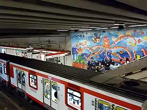 ![]() The station with a stopped train and one of the murals painted by Jorge Artus and the children of the art workshop of the Teletón. | |||||||||||