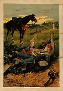 - A wounded soldier is found by a rescue dog who alerts the nurse and ambulancemen of their whereabouts. Coloured chromolithograph, 1904