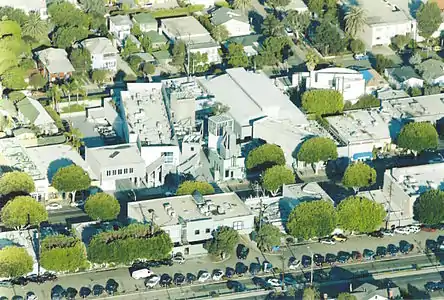 In 1984, Thomas Eatherton, an artist whose studio was in a 2,000 square foot metal outbuilding on the north end of the site, showed neighbor Abby Sher, who had a family history of development,[5] the original ice warehouse with its 25-foot ceilings, clerestory windows, and 8,000 square feet of clear span, and suggested its use as a museum. Sher took the suggestion as the impetus for creating a small piazza-like setting with the museum as its centerpiece. Influences were the Tuscan hill town of Volterra, with its central piazza containing, along with the usual shops and cafes, an Etruscan museum and a large fresco-adorned municipal building;[6] and the 1948 neighborhood shopping center, The Brentwood Country Mart.[7] Sher purchased the Edgemar Farms property in October 1984, and retained the use of the name, Edgemar, for the development.