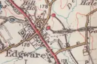 - Aerial view of Edgware station in 1926, looking south-east. Surrounded by fields. The single track line to Edgware LNER station is visible in the distance.