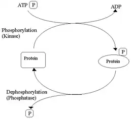 Explained simply, the cycle works like this: a protein kinase moves a phosphate group from adenosine triphosphate (ATP) to a protein, converting it to adenosine diphosphate (ADP). The shape and the function of this protein is thus altered enabling it to take part in converting glycogen into glucose which is used for fuel for muscular contractions. When the protein has completed its role a different enzyme, phosphatase, catalyses hydrolysis of the phosphorylated protein, which reverts to its original state. This cycle takes place to control many metabolic processes.[20][21]