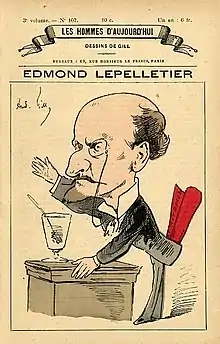 Le Pelletier held very radical views, but they moderated when he began writing for l'Echo de Paris.[2] For many years he was an active propagandist of Freemasonry, and held a high rank in this movement. In January 1882 he founded a Freemasons lodge, Les Droits de l'homme (Human Rights). This quickly became one of the most brilliant and active lodges in the Grand Orient de France. In 1888 he was made a Knight of the Legion of Honour. During a meeting of the Cirque d'Hiver in 1889 he laid the foundations for the great Republican Union movement that defeated Boulangism.[2]