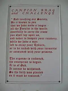 Campion finally entered England in the guise of a jewel merchant, arriving in London on 24 June 1580, and at once began to preach. His presence soon became known to the authorities and to his fellow Catholics lying in London's prisons. Among the latter was Thomas Pounde in the Marshalsea, where a meeting was held to discuss means of counteracting rumours circulated by the Privy Council to the effect that Campion's mission was political and treasonous. Pounde rode in haste after Campion and explained the need for Campion to write a brief declaration of the true causes of his coming.[15] The diffusion of this declaration, known as the Challenge to the Privy Council, or, Campion's Brag, made his position more difficult. He led a hunted life, administering the sacraments and preaching to Catholics in Berkshire, Oxfordshire, Northamptonshire, and Lancashire.[6]