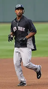 Núñez was called up to the majors for the first time on August 19, 2010 after Lance Berkman was placed on the 15-day disabled list.[18] Núñez debuted on the same day, replacing Jeter in the seventh inning and fouling out in his only plate appearance. Núñez received playing time as a fill-in for Jeter and the then-injured Alex Rodriguez. On August 21, Núñez recorded his first major league hit, a go-ahead RBI single into right field.[19] Núñez hit his first career home run against the Chicago White Sox on August 28, 2010. He also stole his first career base the same day.[20] In 30 games for the Yankees, Núñez hit .280, with one home run, seven RBIs, and scored 12 runs.[14] When Mark Teixeira suffered an injury during the 2010 American League Championship Series, the Yankees replaced him on their postseason roster with Núñez.[21] After the season, Baseball America rated him as the eighth-best prospect in the Yankees organization, while also naming him the "Best Defensive Infielder" and the "Best Infield Arm" in the Yankees organization.[14]
