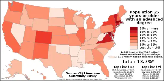 - Note that these add up to more than 100% because they are cumulative; e.g. it is assumed that all people with doctorates also have undergraduate and high school degrees, and are thus counted twice in the "lower" categories. Age 25 is used rather than age 18 because there are few people aged 18 or over with advanced degrees. "Educational Attainment in the United States: 2018". U.S. Census Bureau. Retrieved June 23, 2018. Percentages are calculated based on census data by counting people that had attained that level or higher.